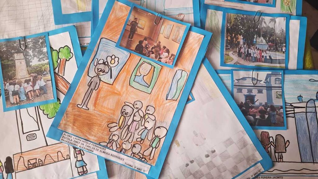 A EMEF Dr. Carlos de Almeida Rodrigues realizou uma releitura por meio de desenhos inspirados em registros fotográficos da visita ao MACC (Museu de Arte e Cultura de Caraguatatuba). Os estudantes exploraram diversas técnicas das artes visuais, destacando-se o uso de perspectiva de piso e a representação de estruturas arquitetônicas, como igrejas, praças e o próprio museu.